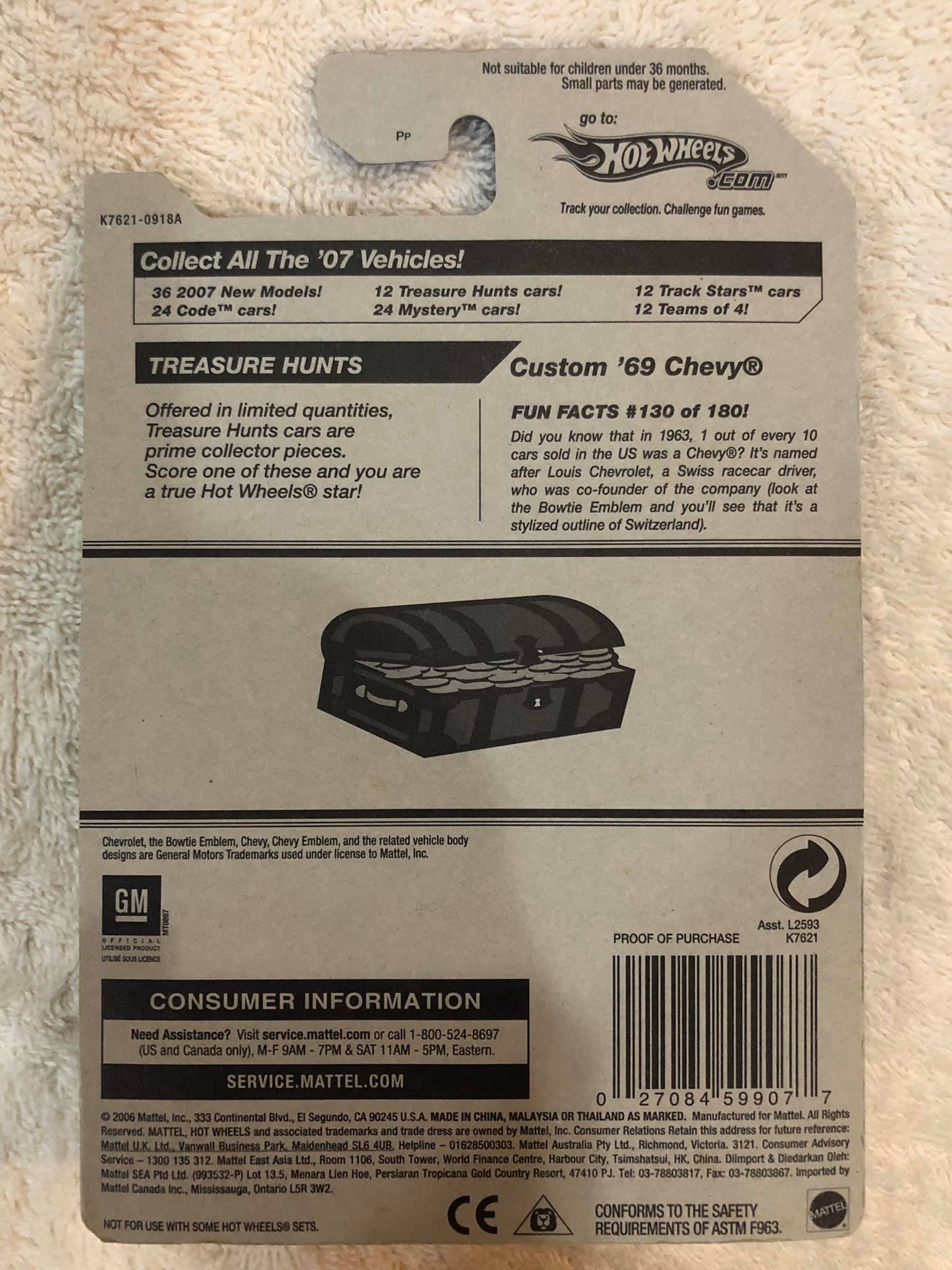 Custom ‘69 Chevy (Treasure Hunts)は、Hot Wheelsの中でも特に人気の高いコレクターズアイテムです。独自のデザインと細部にまでこだわった作りが特徴で、コレクションの中でも際立つ存在です。この特別なモデルは、貴重なTreasure Huntsシリーズの一つであり、お宝のような価値を持っています。